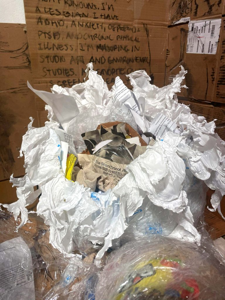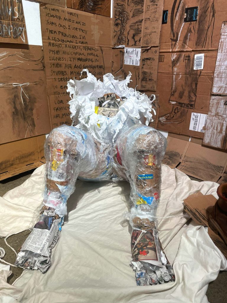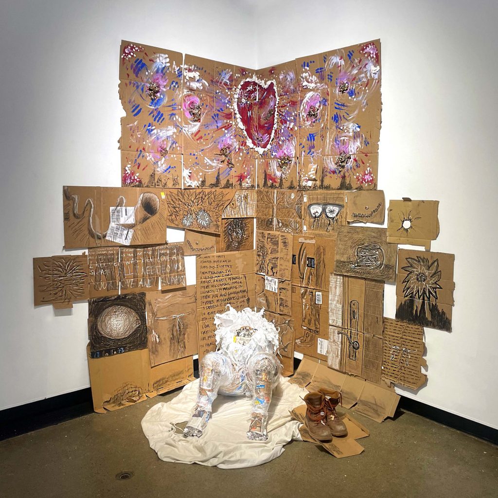 cardboard, acrylic paint, trans joy, charcoal, shoes, messy hands, bread tags, empty bottles of sertraline, found objects, hot glue, nails, plastic wrap, trans rage, and torn beverage trays