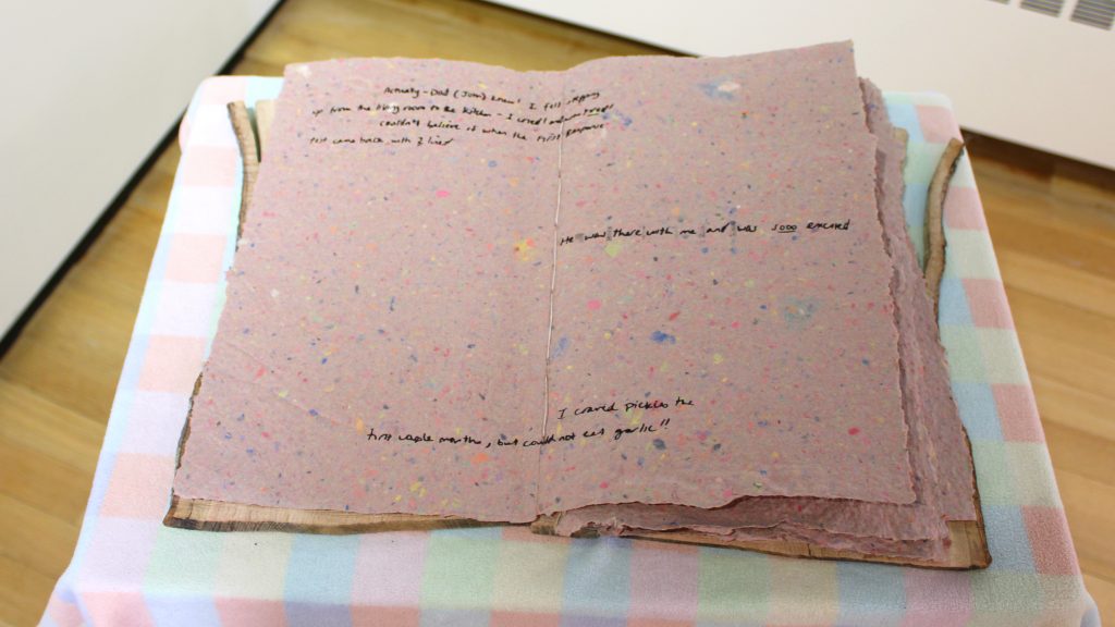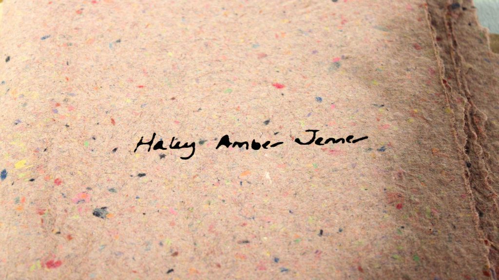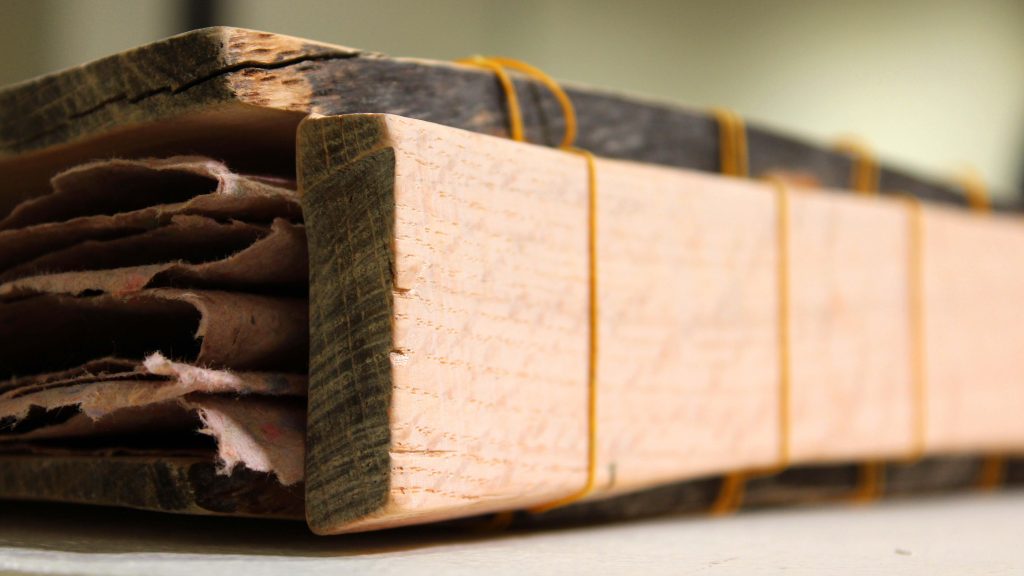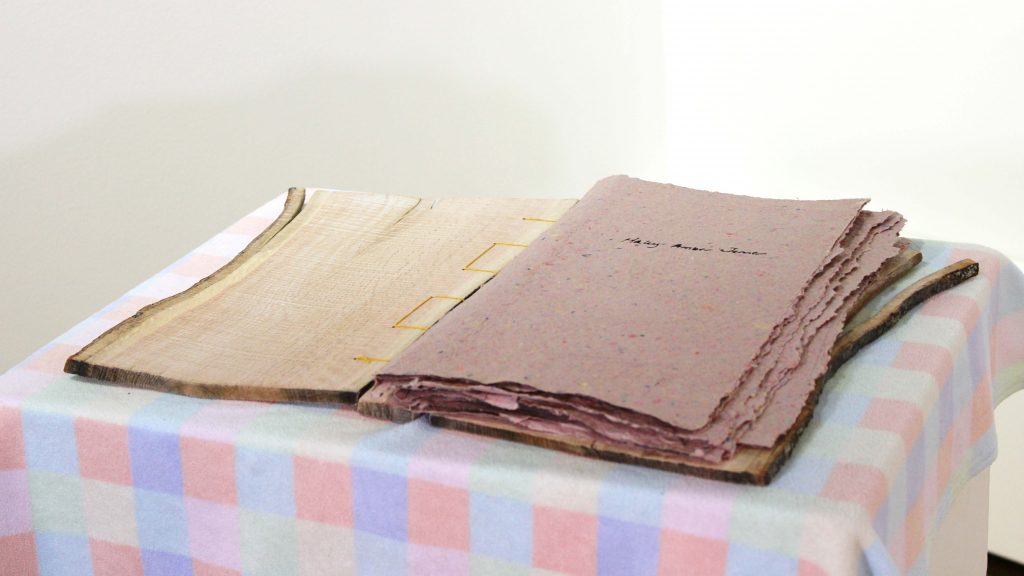 sliced log, every speck of dust, waxed threads, feeling my mom’s handwriting, construction paper, one of my baby blankets, dog hair, pressure, leftover kid’s doodle paper, my hands, the real baby book, time, and black ink