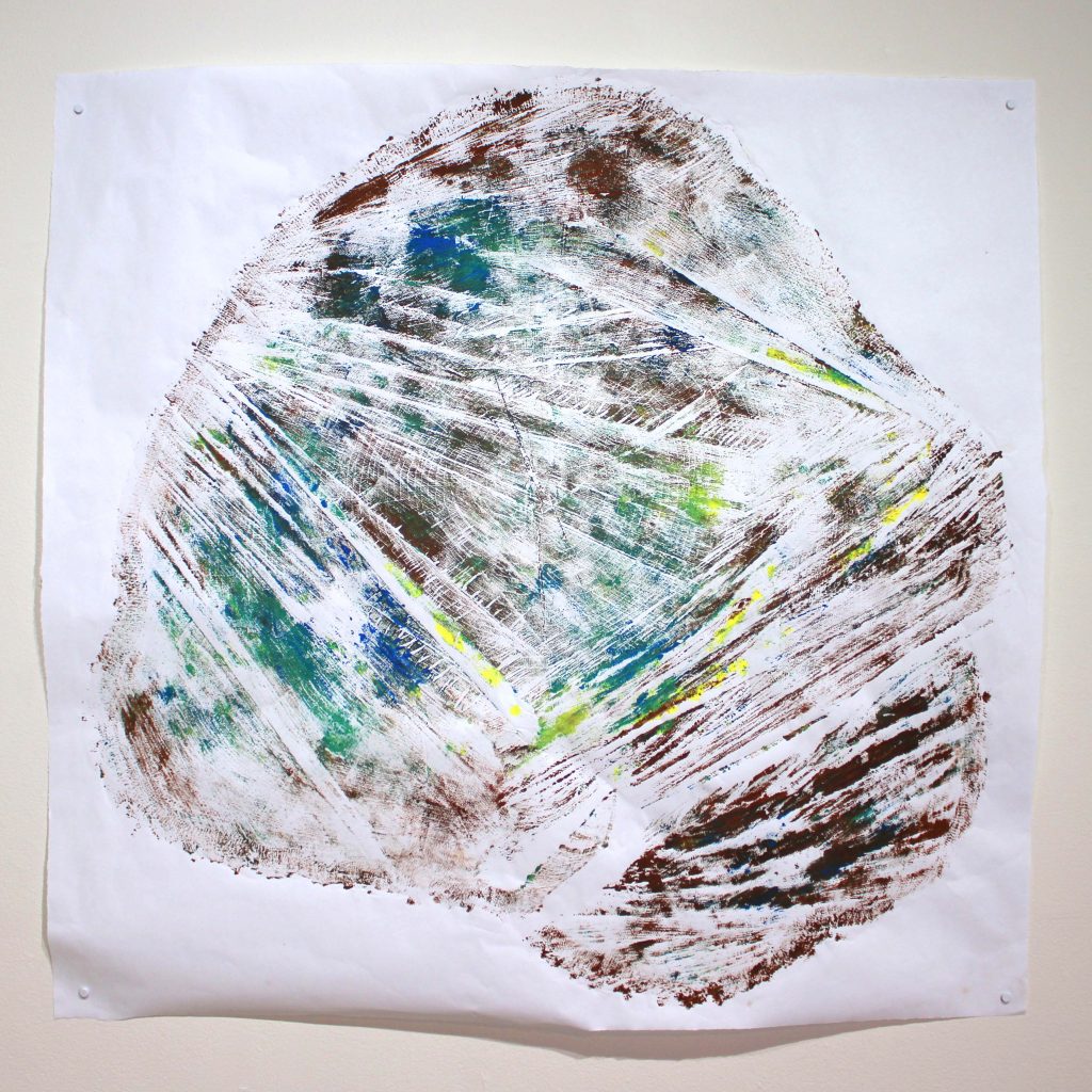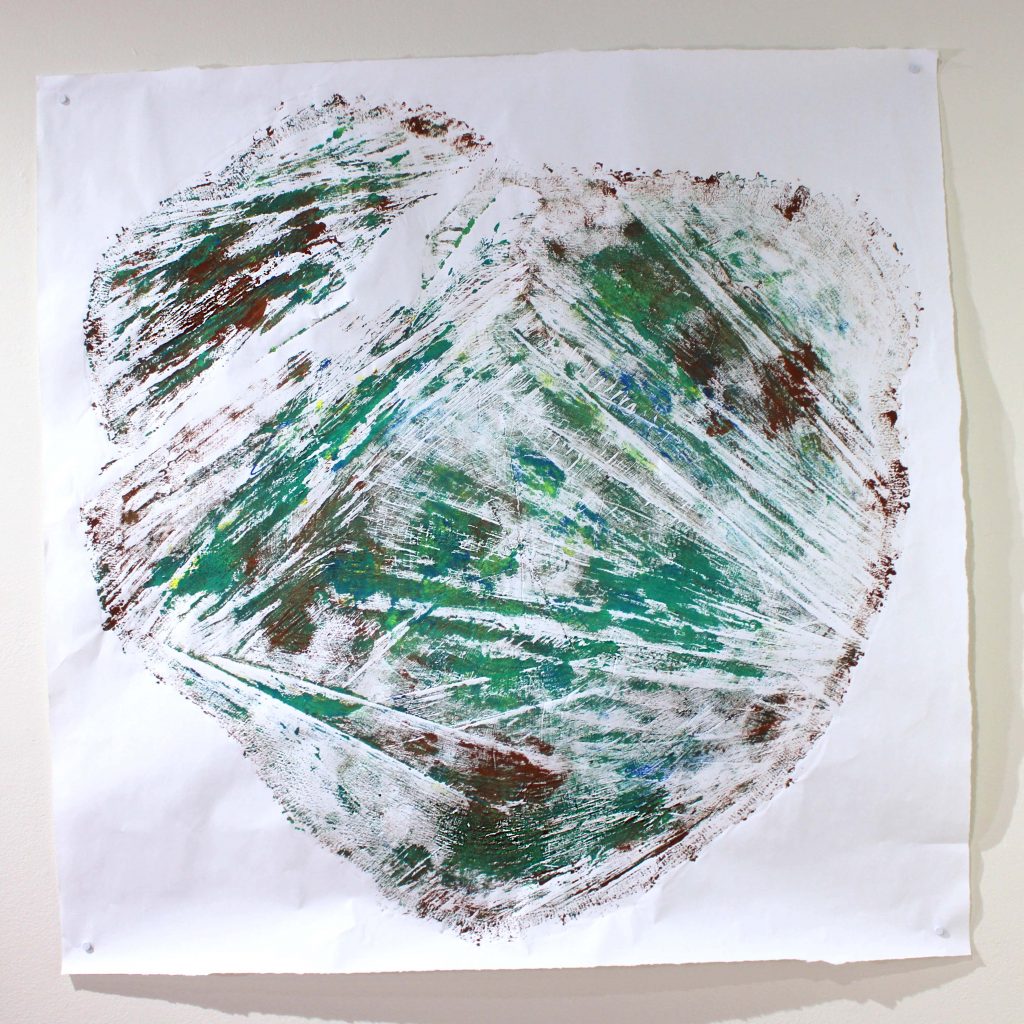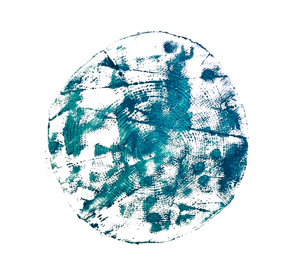 acrylic paint, my fingerprints, log slice prints, raw canvas, my favorite filbert brush, projections, picking up the pieces, and memory